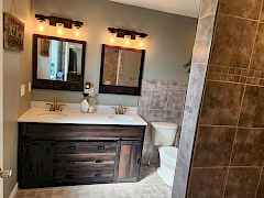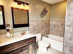 Hardboard, shake siding with stone accentsComposition roof